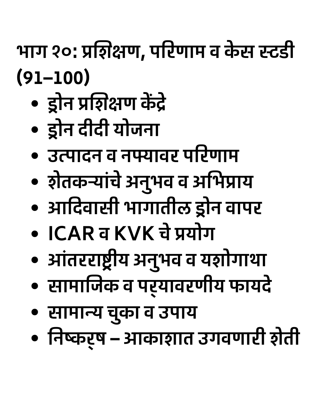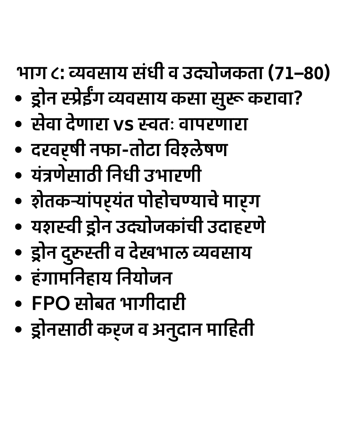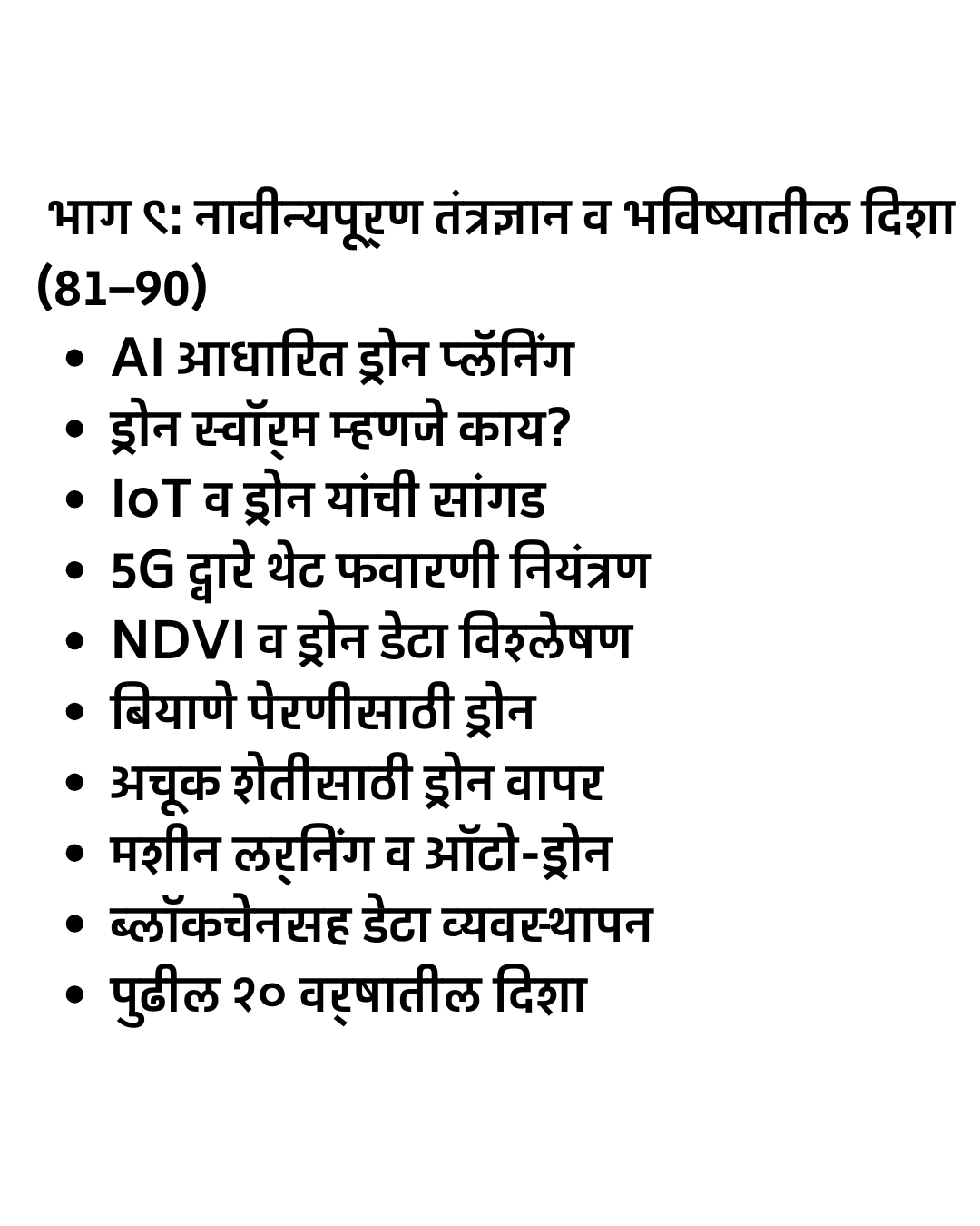 “Smart Drone Sheti – Ek Sampurn Margadarshak” हे मराठीत उपलब्ध असलेले सर्वात संपूर्ण आणि व्यवहार्य ड्रोन शेती मार्गदर्शक पुस्तक आहे. या पुस्तकात स्प्रे ड्रोन, सर्व्हे ड्रोन, NDVI मॅपिंग, अचूक शेती (Precision Farming), ड्रोन फवारणी तंत्र, ड्रोन सर्व्हे डेटा विश्लेषण, तसेच DGCA नियम व परवानग्या यांचे स्पष्ट आणि सोपे स्पष्टीकरण दिले आहे.